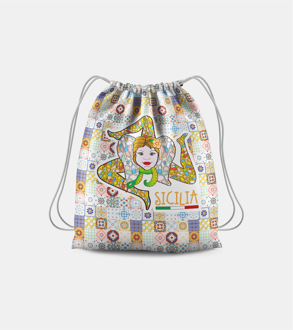 Sacca Trinacria 100% Poliestere. Peso: 150 gr. Manici lunghi. Misure: 38×42 cm Stampato in sublimazione Lavaggio a freddo (40°) ed al rovescio.